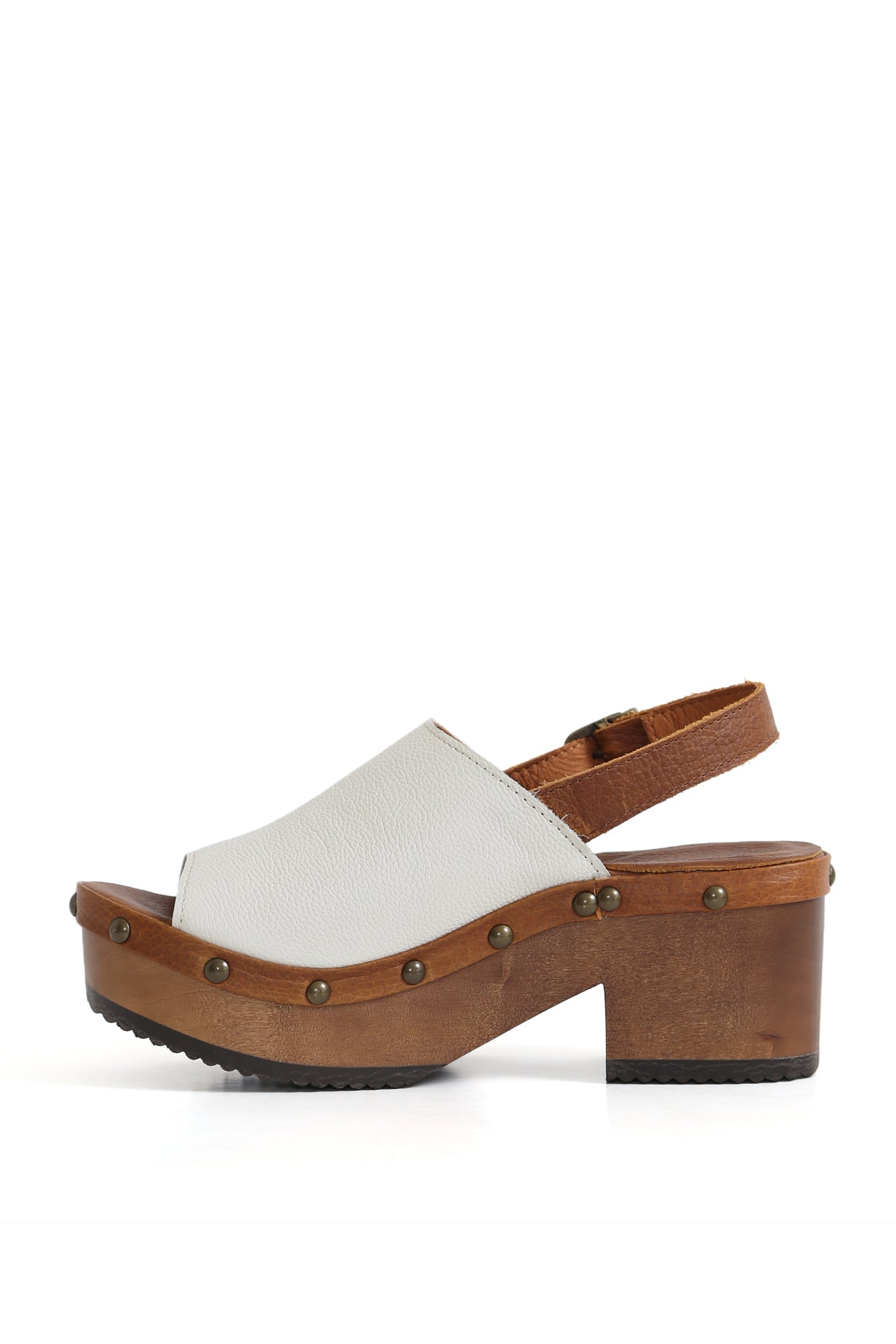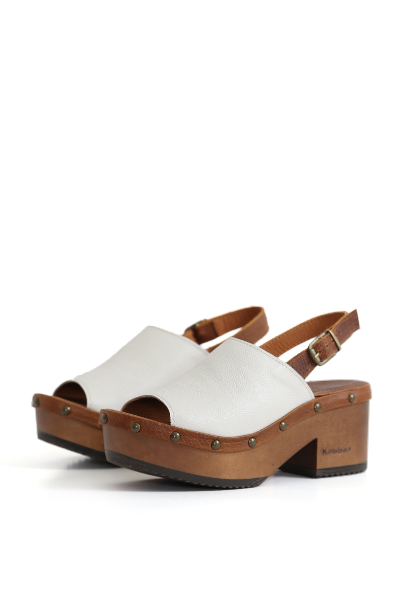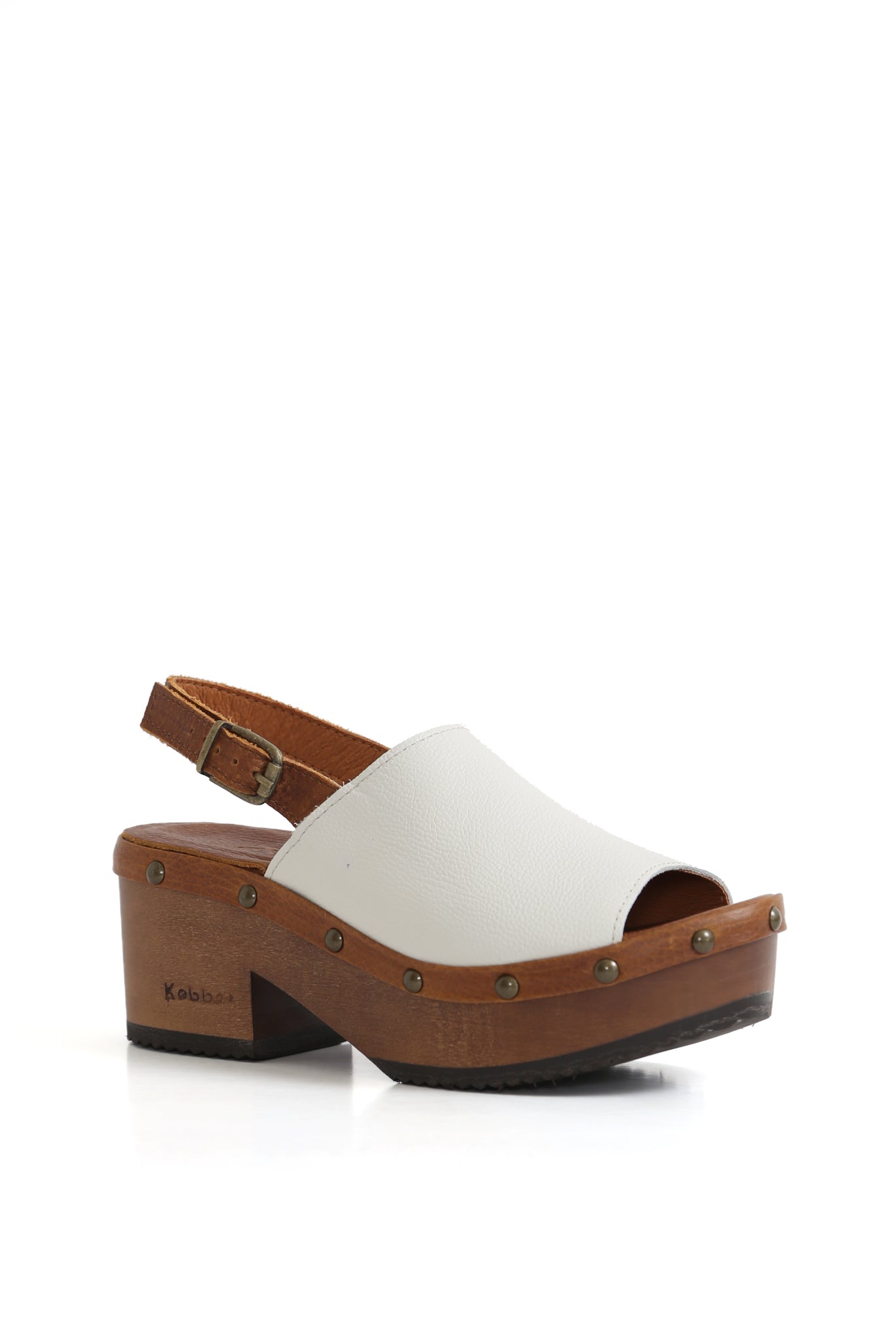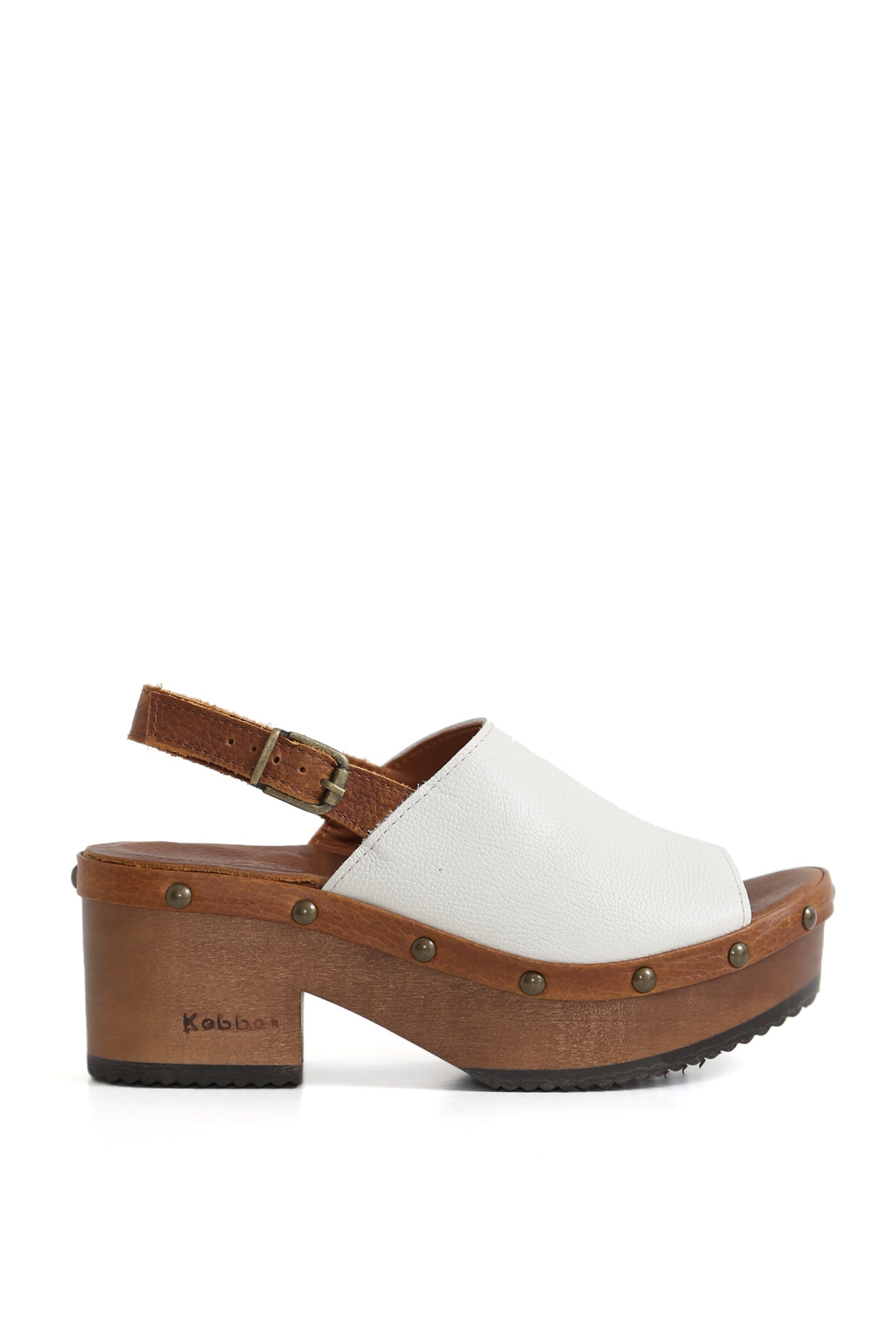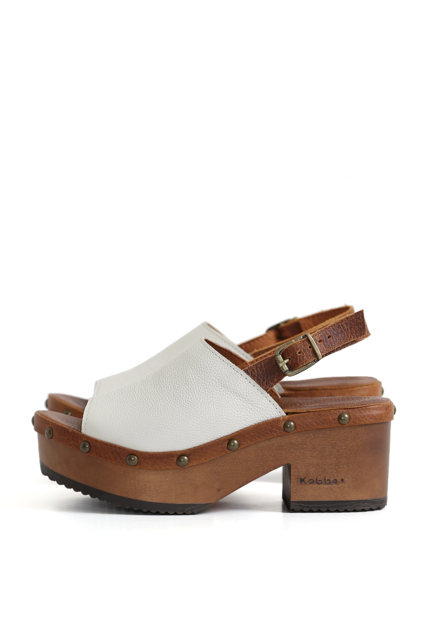 El BUA Escarlata Motoquero Blanco es un diseño de zuecos de mujer para vestir, fabricado en cuero blanco con detalles metálicos que evocan el estilo motoquero. Su planta BUA de madera nativa de 8 cm aporta altura con comodidad gracias a su forma anatómica, característica esencial de los zapatos anatómicos Kebba.