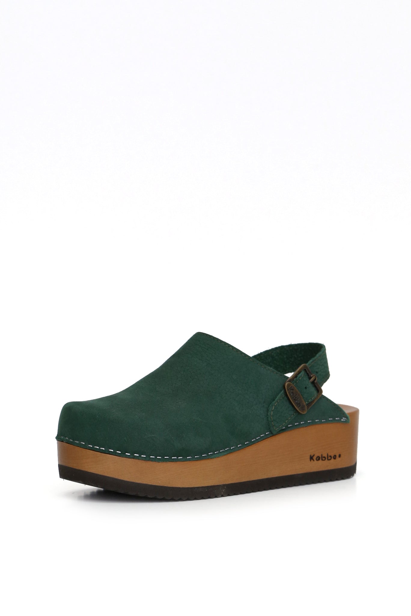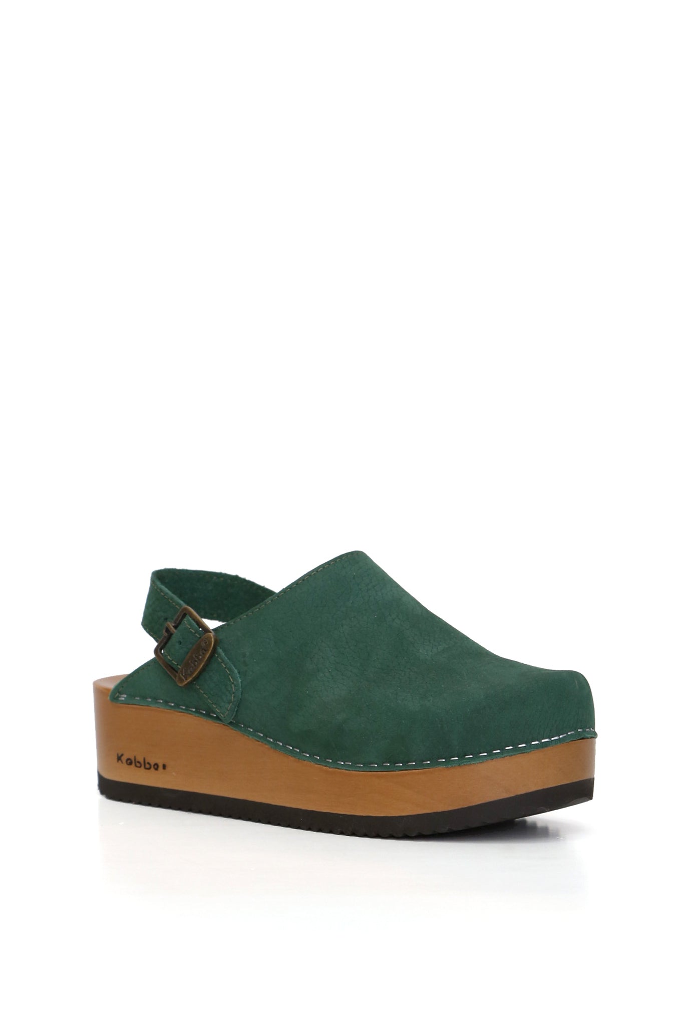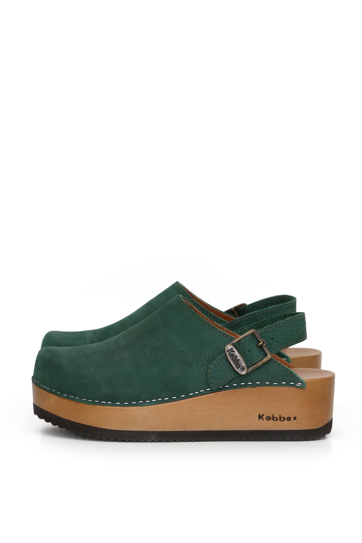 Zueco de cuero color verde, capellada cuero 2.2mm al corte sin forro con correa ajustable, planta anatómica Cloc de madera nativa, altura 5 cms.
