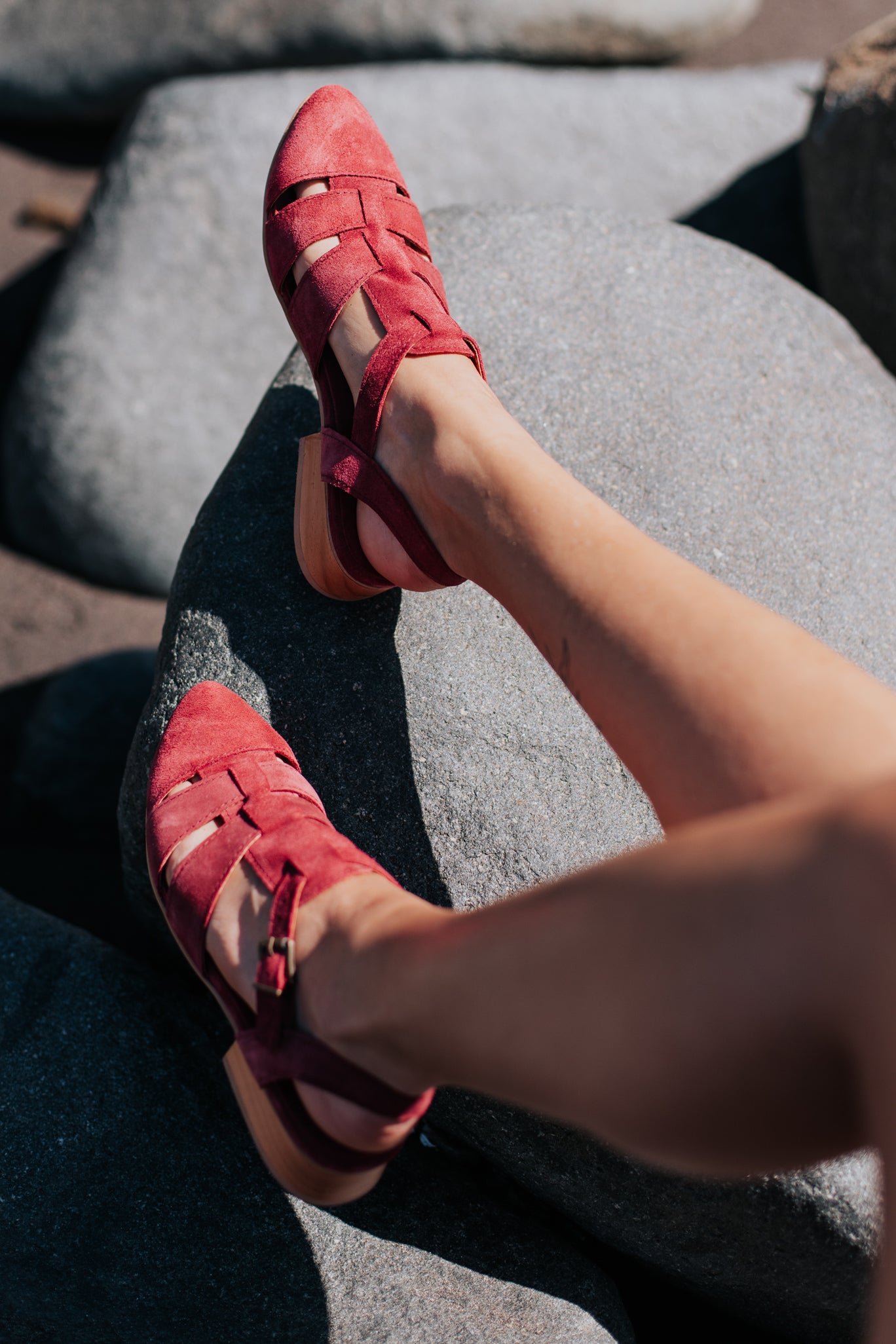 Diseñada para quien valora la elegancia, esta sandalia cuenta con materiales. El Renobuk de alta durabilidad se ajusta al pie con suavidad mientras el tacón de madera de 3,5 cm ofrece la elevación justa para transitar con seguridad desde la oficina hasta encuentros informales. La punta cerrada y correa trasera ajustable aseguran un calce firme en cada paso. En tono ruibardo que trascienden tendencias, cada detalle responde a una filosofía donde la funcionalidad y la belleza no compiten, sino convergen.