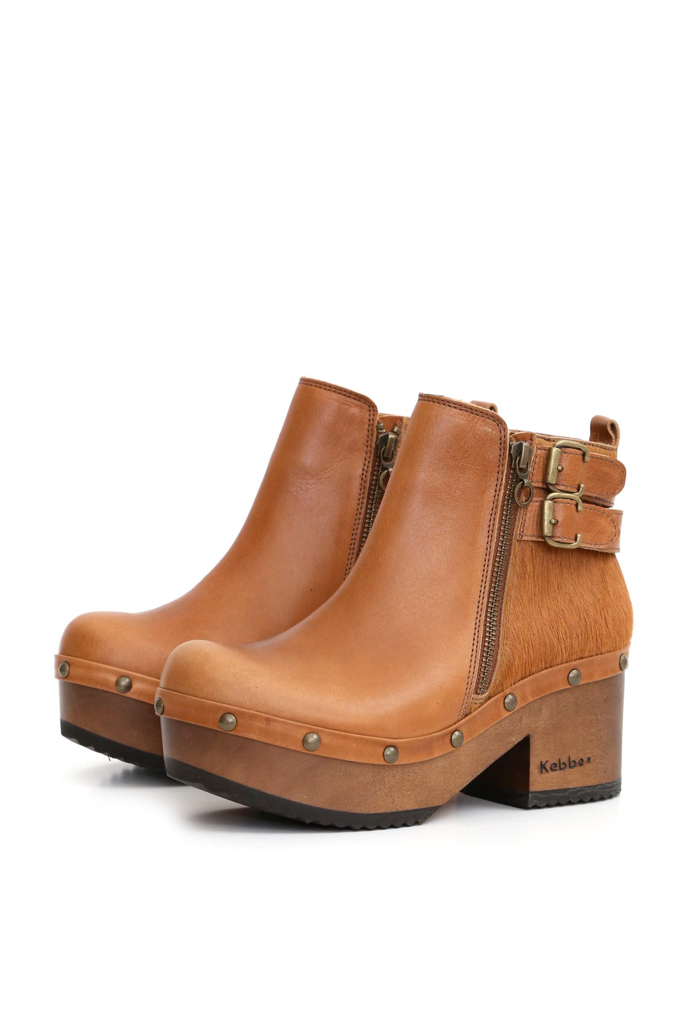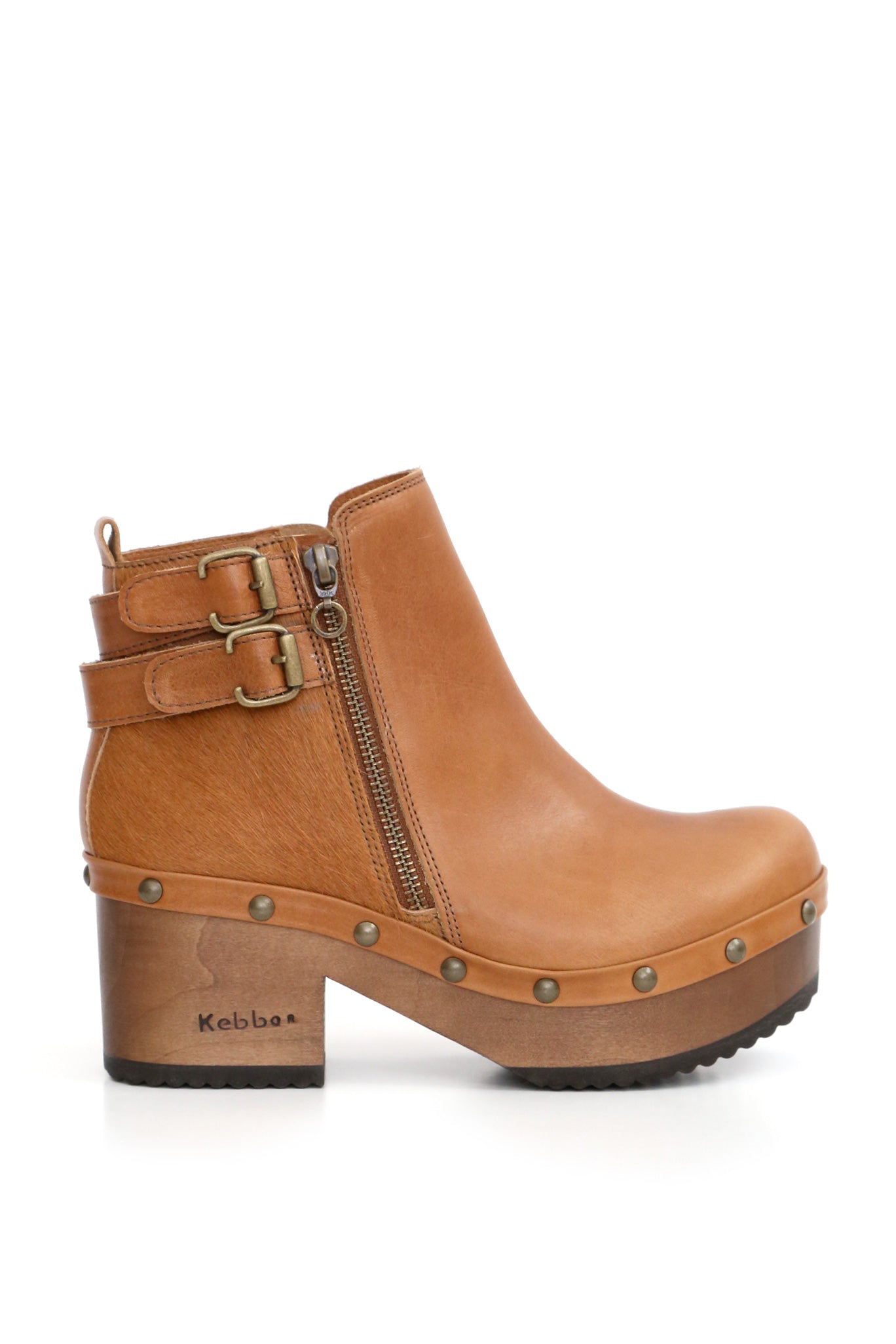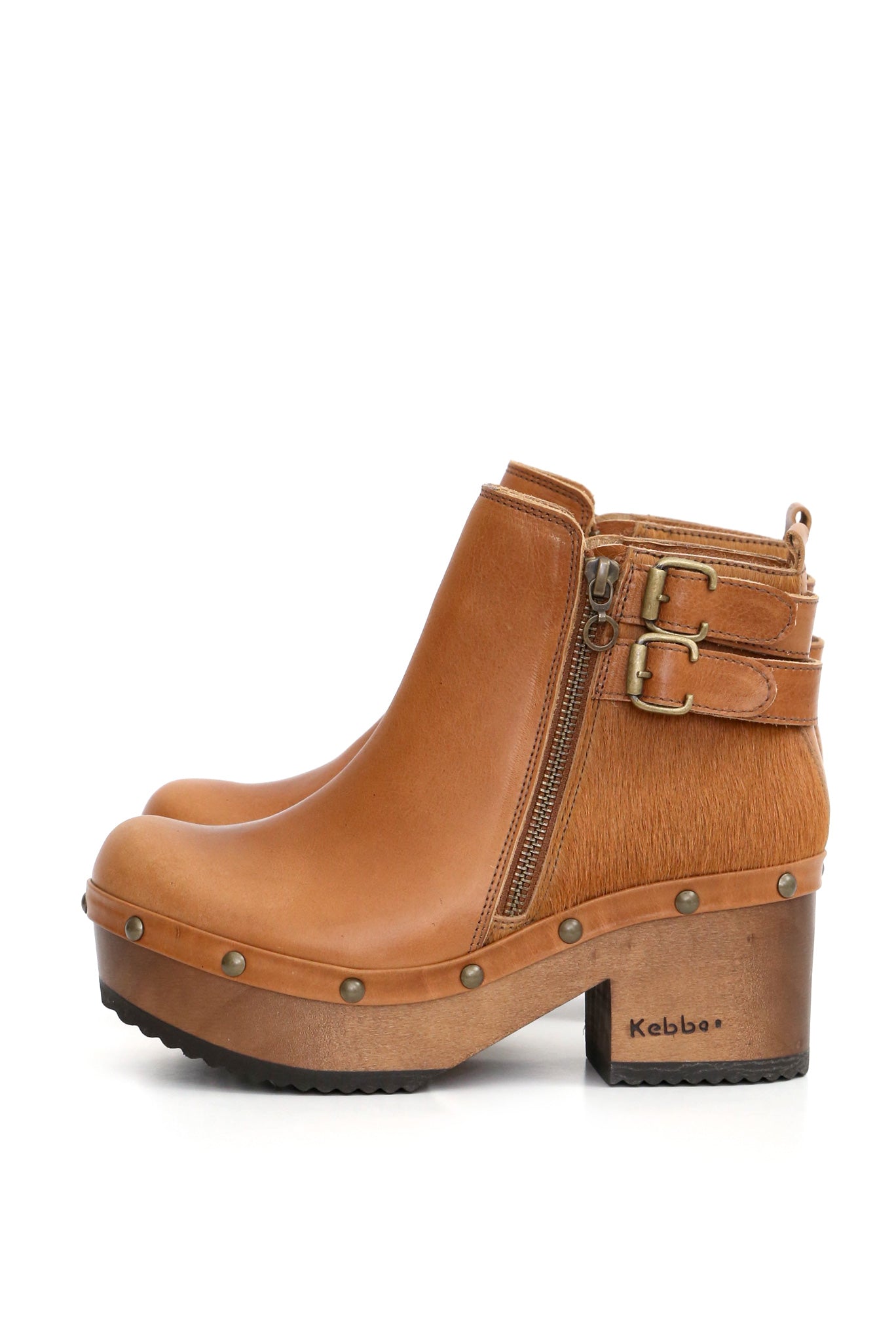 Color Sierra, capellada cuero color camel con cuero de pelo en el mismo tono, forro y plantilla de cuero. Cierre metálico en ambos costados para ajuste y 2 hebillas decorativas.
