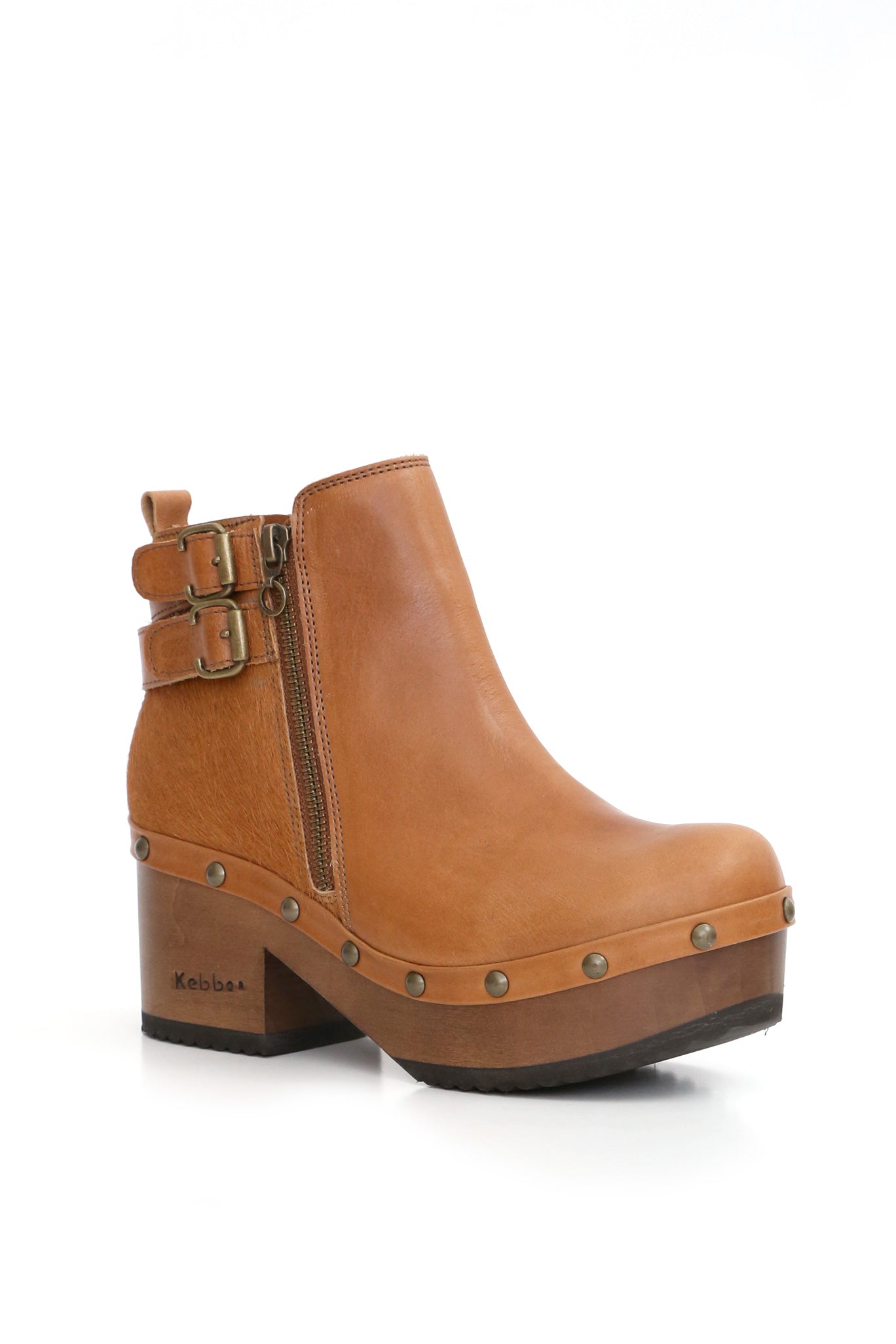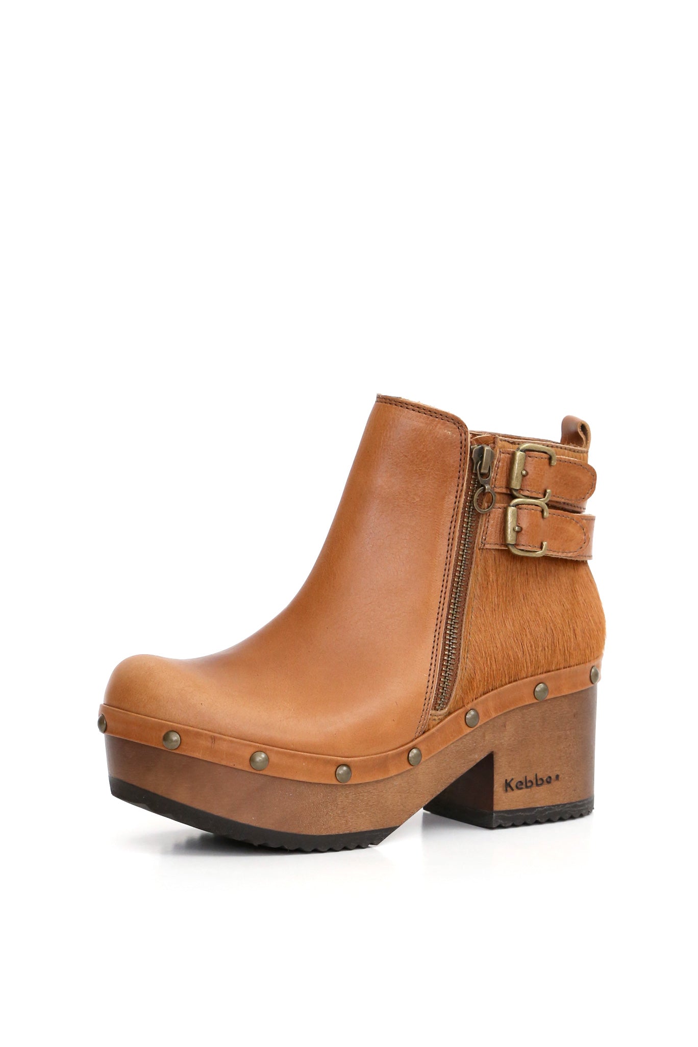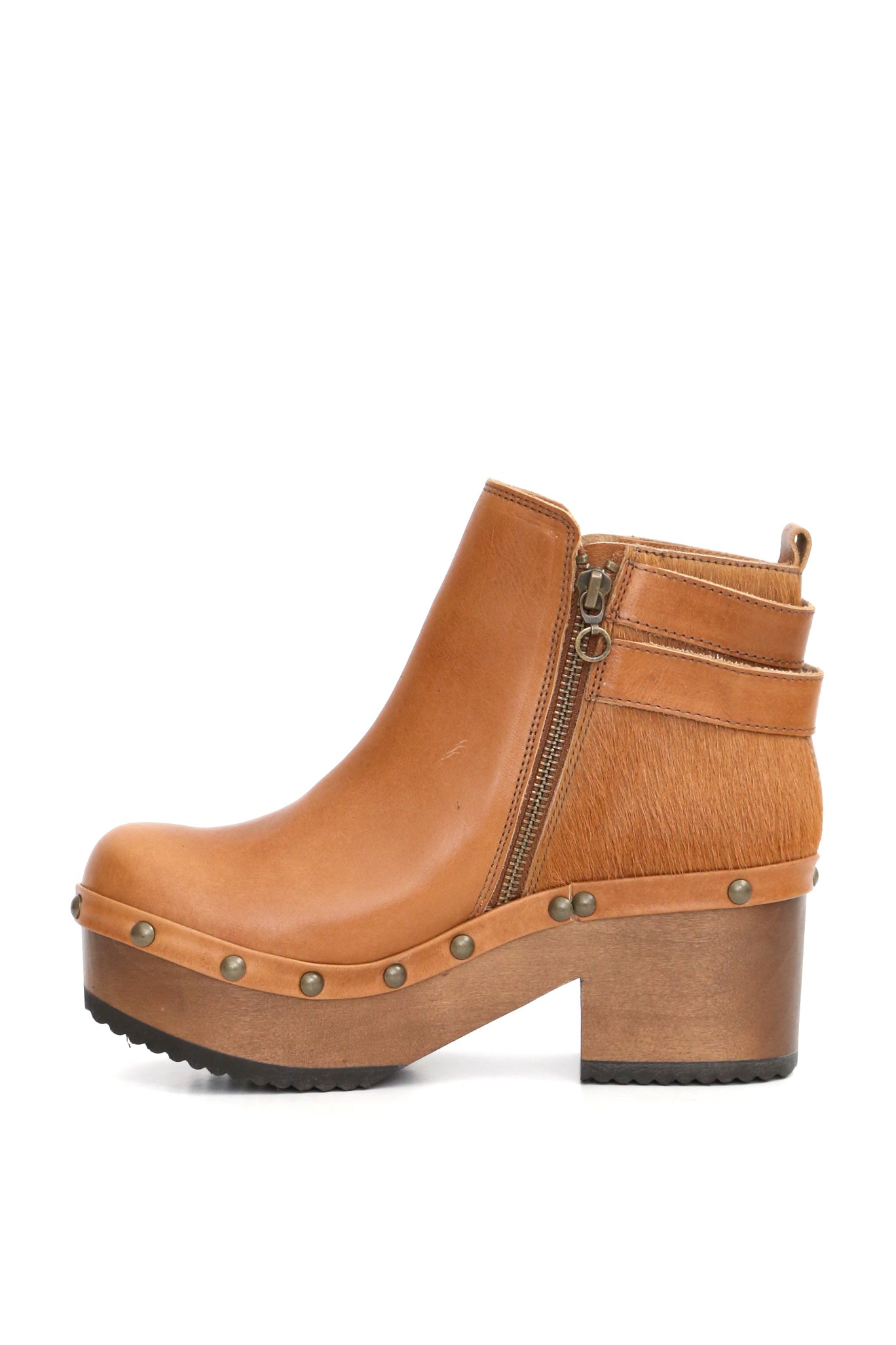 Color Sierra, capellada cuero color camel con cuero de pelo en el mismo tono, forro y plantilla de cuero. Cierre metálico en ambos costados para ajuste y 2 hebillas decorativas.